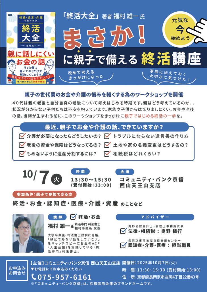 「コミュニティ・バンク京信 草津支店」で開催した「まさか!に親子で備える終活講座」。